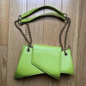 This is a trendy designer luxury inspired geometric unique Lemon Lime Yellow Green Mini Bag with two removable shoulder chain handles that can be connected with the carabiners at the end to create a long crossbody strap. You can also remove the straps all together and carry it like a cute clutch. No brand, got it from Amazon.