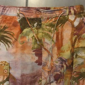 Please feel free to ask any questions. Skirt is new with out tags. Beautiful moody mauve, orange and olive color with abstract tropical and animal print fabric. Cargo pockets on either side. Waist has both a drawstring and is stretchy, stretches to about 17" easily. Meant to mid rise but could be high waisted too. Lighting makes the skirt look more orange but it's more mauve/dusty rose.