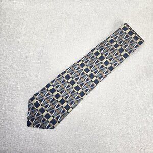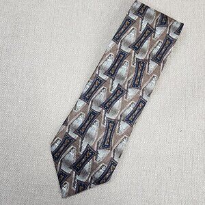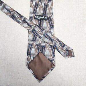 Nikka Dori: Tan, Brown, white, blue, geometric design,100% silk, Made in Italy, Measurements 4" W x 58" L