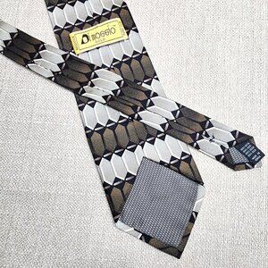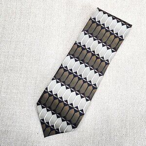 Di Moggio Gold: Bronze, white, black, geometric design, 100% silk, Handmade in Korea, Measurements 3.75" W x 58.5" L