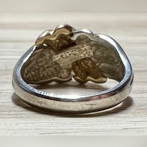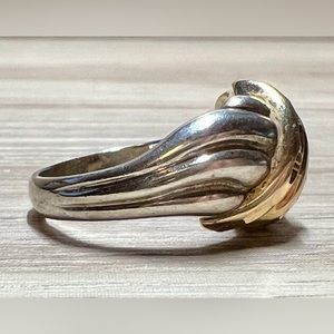 The ring comes in size 6 and is signed by the designer. It has a dome/band style with a two-tone, classic, and vintage theme. The metal purity is 925 and 14K. This unique and handmade piece of jewelry is perfect for anyone who loves beauty and designer items.