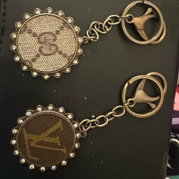 Elegant designer keychain set with monogram details. Features brown and gold tones.