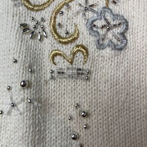 A few stains are Present as Shownand a repair to the sleeve. Get into the Christmas spirit with this beautiful cream-colored sweater from Designers Original Studio. The sweater features a tight-knit pattern with beaded and embroidered accents, perfect for adding a touch of elegance to your casual winter wardrobe. The cardigan-style sweater has a crew neckline and long sleeves, making it suitable for any occasion.