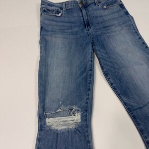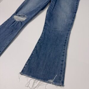 Designer PAIGE Rory Crop Flare Jeans Womens Size 31 Mid Rise Raw Hem Denim Blue