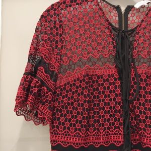 Designer Parker red short sleeve dress. I wore this dress once to a wedding. The dress is red lace with a black slip underneath. This dress doesn’t stretch, but still very figure flattering. I take very good care of my things and the dress is in perfect condition. My home is smoke free and I have no pets.