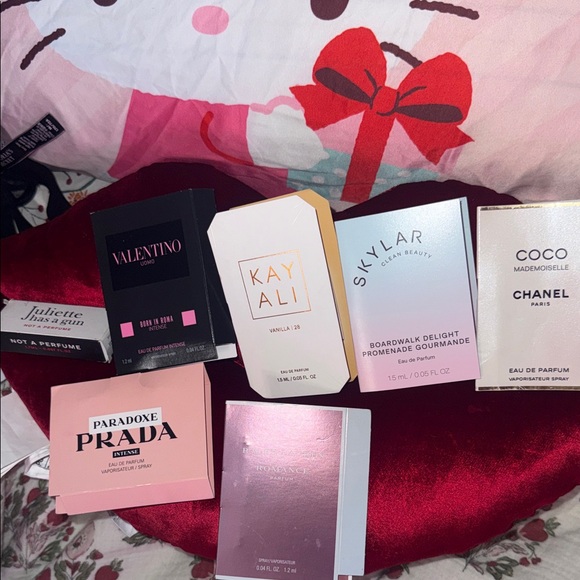 Collection of designer perfume samples. Includes brands like Prada Paradoxe , Valentino Born In Roma , Chanel, Skylar Clean Beauty , Ralph Lauren , Kayali , and Juliette Has a Gun. Perfect for trying new scents.