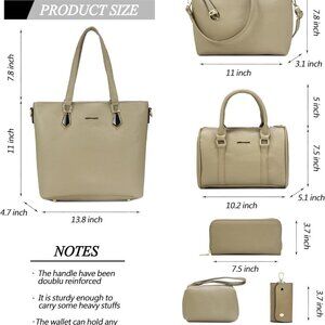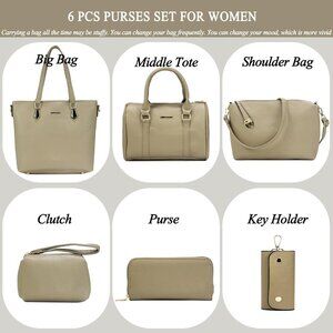 Dimensions of the women handbags 6pcs purse set: large tote bag:13.8"L x 4.7"W x 11"H,Handle height:7.8";middle tote bag:10.2"L x 5.1"W x 7.5"H;shoulder bag:11"L x 3.1"W x7.8"H;clutch:5.5"L x 3.7"H;purse:7.5"L x 3.7"H; key holder:2.2"L x 3.7"H.One separate adju