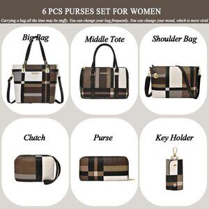 Dimensions of the women handbags 6pcs purse set: large tote bag:13.8"L x 4.7"W x 11"H,Handle height:7.8";middle tote bag:10.2"L x 5.1"W x 7.5"H;shoulder bag:11"L x 3.1"W x7.8"H;clutch:5.5"L x 3.7"H;purse:7.5"L x 3.7"H; key holder:2.2"L x 3.7"H.One separate a