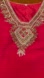 Step out in style with this elegant red embroidered Indian suit. Perfect for any occasion, this piece combines comfort and fashion effortlessly. Gold thread and pearl work on front, back and sleeves, heavy work on pants. Used once for fashion show. Pure chinon.