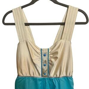 This Roberta Oaks Hawaii dress is a handmade piece from Honolulu, available in size medium. It features a knee-length design, crafted from a blend of Lycra and cotton. The dress showcases a cream and teal Hawaiian theme with a sweetheart neckline, striped wide straps, and silver trim. Perfect for summer! It features decorative buttons on the bodice and requires hand washing. Originally sold exclusively in the Roberta Oaks Hawaii boutique, this pre-owned dress is in great condition with a barely there stain as pictured. Aloha!