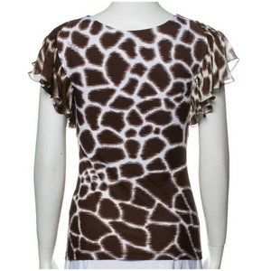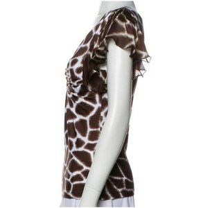 NEW DESIGNER ROBERTO CAVALLI BROWN AND WHITE ANIMAL PRINT 100% SILK, RUFFLE SLEEVES V NECK BLOUSE