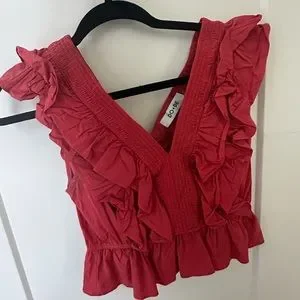 This is a ruffled top from a local boutique in Nashville. Worn 2 times. Needs to be steamed but ready to go and fits nicely to your body