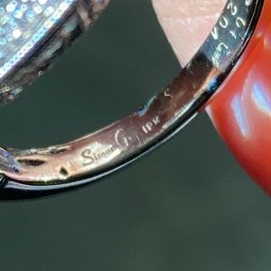 It is Hallmarked on inside of band Simon G, 18K ~ and I believe .88 and 2.04 because very