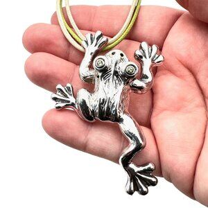 Make a statement with the Designer SX Womens Necklace featuring a Sterling Silver Green Peridot Frog Pendant on a Cord. This 3-inch pendant, hanging from an 18-inch chain, adds a touch of whimsical elegance to any outfit.