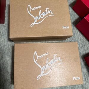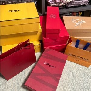 Collection of designer shoe boxes including Fendi, Louis Vuitton, Carolina Herrera Ferragamo, Cartier and Christian Louboutin. Vibrant colors of red, yellow, and tan. 9 boxes and 2 bags. All authentic. Some in perfect condition some in good condition.