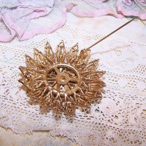 Dating to the 1960s or so, here's a designer signed LISNER yellow gold tone metal costume pin brooch in the shape of a 3-tiered flower. Safety catch at the back to hold the pinstem in place. Size is 1-7/8" wide/high; depth is about 5/16". Condition is wonderful with no problems I can spot.