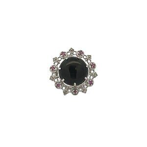 This listing is for a nice preowned designer ring. This is designed out of sterling silver, features pink topaz and a large round onyx stone. This has a diameter of 1” and a weight of 11 grams. Nice preowned condition. Add this to your collection.