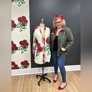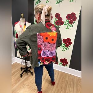 This designer influenced jacket features red and green striped ribbon with bees and a bold and beautiful flower print. The jacket is a dark green denim with a slight shimmer finish. It a snaps down the front and has front, side pockets. Created with princess seams. It is lightweight and can be worn on its own or as an extra layer. It is a size 2x in women’s.