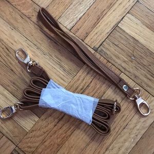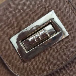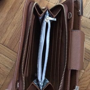 Brown wallet with gold detailing. In great condition, only small signs of wear around the clasp as shown in photo two. Plenty of room for money, cards, and coins. Comes with attachable handles.