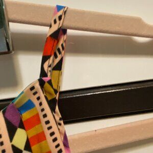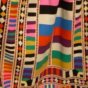 Purchased from the Las Vegas Neiman Marcus in 2010. I know it is a famous designer, but I sadly cut off the label because it was super itchy/scratchy. I have tried to locate something close to this to figure out the name of the designer, but I have failed. Besides the tag missing, it is in super fabulous condition. I wore only a handful of times. No stains or rips. I just love the print and coloring of the tank. I would wear under a suit jacket and then take off jacket for after work cocktail events. I always got compliments on the blouse. Dry clean only...apparently no instructions tags left on either.