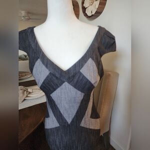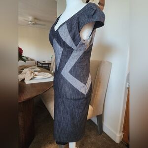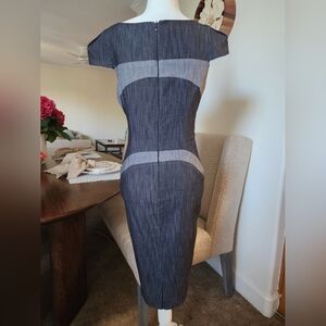 expertly tailored sophisticated black and grey dress by Dina Bar-El- the fabric has a great stretch- reminds me of a chambray denim- bit light/mid weight the paneling is so slimming- elegant- fully lined back zipper excellent condition like new!