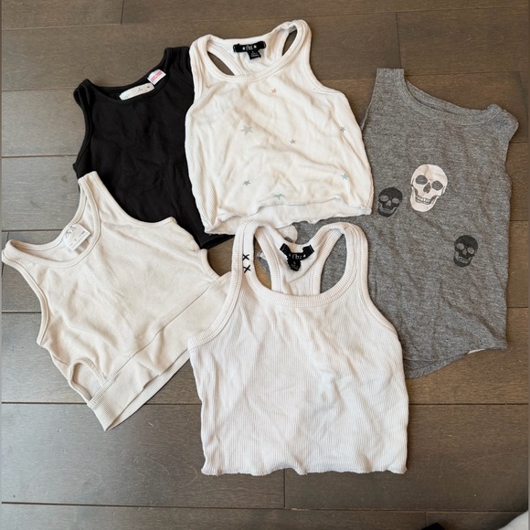 Designer bundle of tanks! Sizes 5t &6t with one 3t (runs big). The FBZ run small. I would say this will fit 4t best but my daughter wore tanks as crop tops for a while!