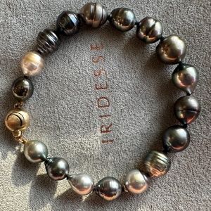 This particular bracelet is a multi-colored (blacks/greys/silver) tahitian baroque ringed pearl bracelet