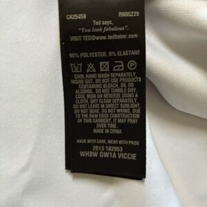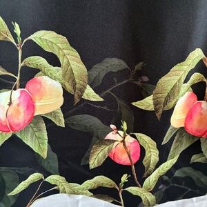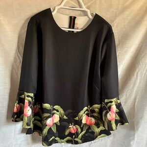 The Ted Baker London top displays a watercolor peach design. The shape is tappered at the waist giving it the look of a slight peplum. The back zipper is large and part of the design element.