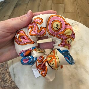 Elegant silk scarf by CHANEL that has been turned into a scrunchie. Features a lively mix of colors. Ideal for a stylish touch.
