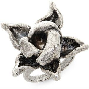 Awesome and 100% authentic Valentino Garavani designer ring set. Brand new. Darkened silver metal. Features a beautiful opening rose on the main ring and 4 other cable twist rings that are meant to be used on other fingers or stacked. Main unicorn ring is about a size 6.75 and the others vary. Marked with the V logo and Italy on the inside of the rose. New with Tags.