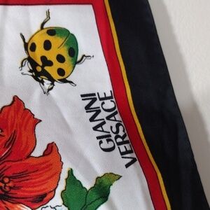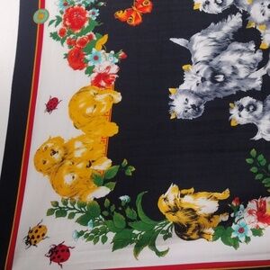 Make a bold fashion statement with this vibrant Versace 34"x34" designer square scarf featuring an eye-catching puppy dog and floral print. Crafted with high-quality silk-like fabric, this playful and luxurious scarf showcases adorable dog breeds like Westies, Dalmatians, and Golden Retrievers surrounded by red florals, butterflies, and a black-and-white contrast border. Perfect as a neck scarf, hair wrap, handbag accent, or wall art.
