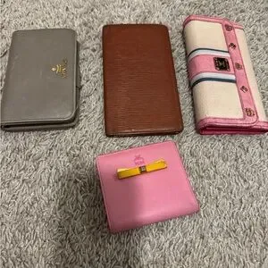 authentic. Lv vintage wallet no date code made before 80, mcm exterior I dropped nail polish so I I wiped off the pink color inside is good. Small mcm wallet in good condition. Prada missing puller . Final sell no return as is condition. Price for 1 wallet ONLY. All 4 for $120