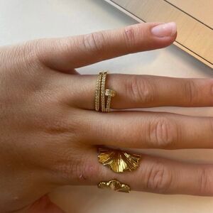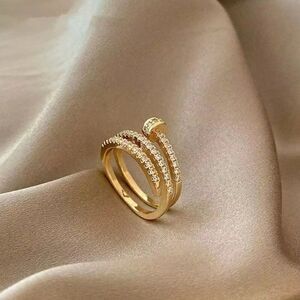 This gorgeous statement ring features cubic zirconia gems framed by a 14k gold-plated gold band in a twisted nail design.
