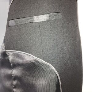 Tailored blazer, fully lined. 2 button closure. 4 buttons at cuff. 77% wool, 19% nylon, 4% spandex. 2 flap pockets + breast pocketCompletely lined. inside pocket.