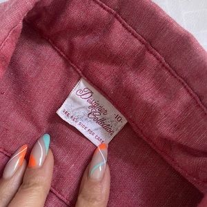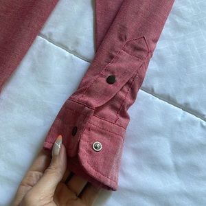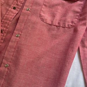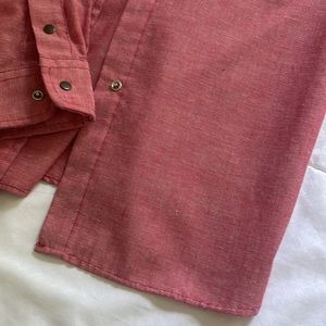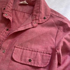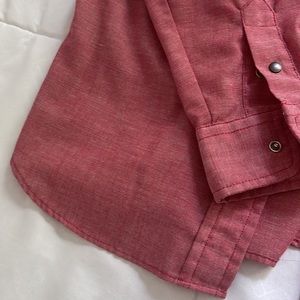 Size 10, fits like a medium. Pit to pit 19”, length 23”. Soft light red color. Snap buttons on the front and wrists