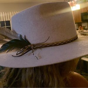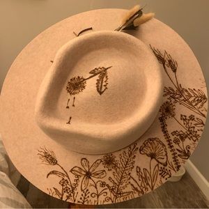100% wool hat. These hats are artistically burned and assembled for a definite statement. All hats have a sizing string inside the hats. No 2 hats are identical.
