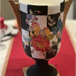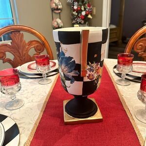 Ceramic hand painted urn / vase has been hand painted in black and white checks, then decoupaged with a Mackenzie Childs flower market napkin and accented in gold. This is not Mackenzie Childs. It measures 12” tall