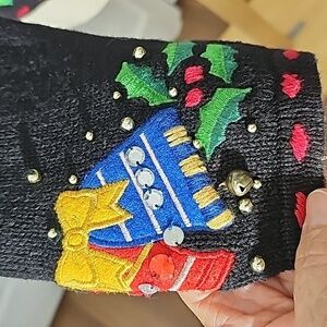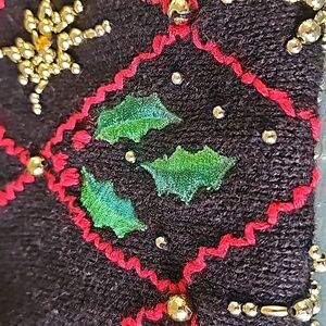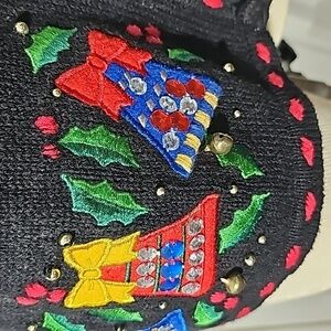 This adorable sweater has so much detail and in very good condition and quality. Lots of enbroidery, covered buttons. Single bells. Black with all the Christmas colors. Size large. Pit to pit flat measurement is 23". Sleeves are about 19".