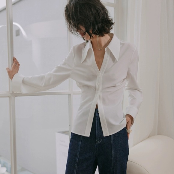The white shirt has a sharply designed collar that adds an edgy aesthetic. It is tailored at the waist, which accentuates the body's curves, giving the wearer a defined silhouette. The deep and wide neckline with extended collar points enhances its fashion-forward appeal, while the overall loose fit balances the look with a modern and sophisticated ease. The fabric of the shirt is soft and breathable, ensuring comfort and a pleasant feel against the skin throughout the day.