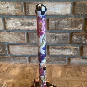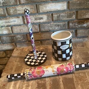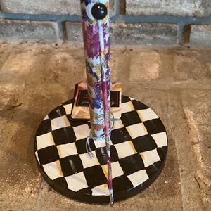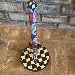 This is a new Stsinless steel Paper Towel Holder I hand painted the base and decorative ball in black and white check, decoupaged the pole with a Mackenzie Childs, Flower Market Napkin and finished with a sturdy clear coating. This is not Mackenzie Childs. See my closet for inspired home decor.