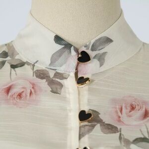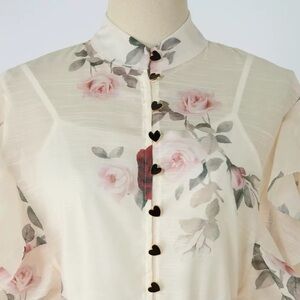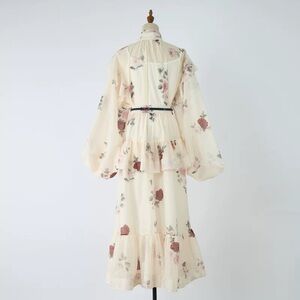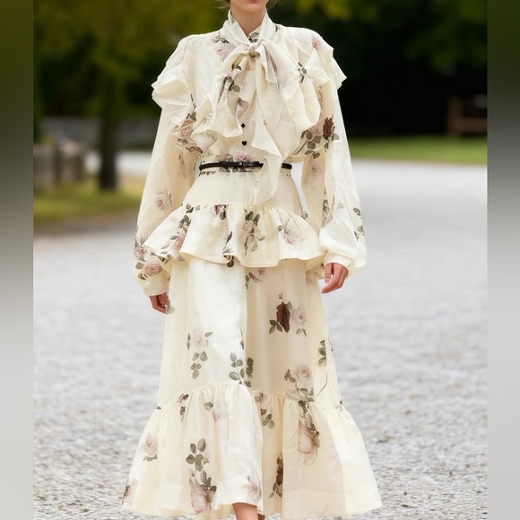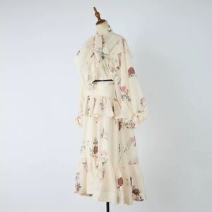 Elegant floral maxi dress with ruffle details. Features a tie-neck design.