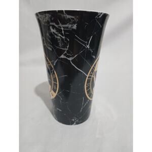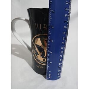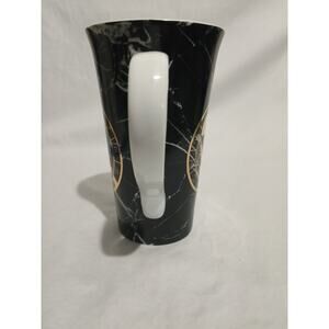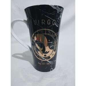 Stylish zodiac coffee mug from designers choice by Coventry. This porcelain mug stands 6 in tall slightly wider at the top with a heart-shaped handle. The opening is about 3 and 1/2 in. It features the zodiac wheel with the Virgo symbol in gold on a black and white marbled background.