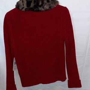 Rich red or garnet color, puffy faux fur collar to help keep u warmer.