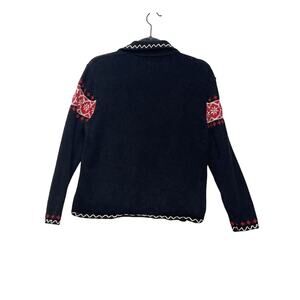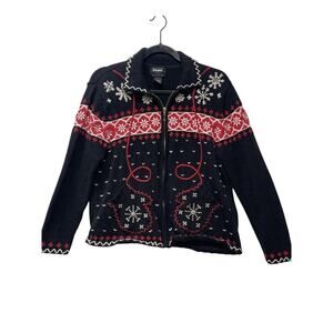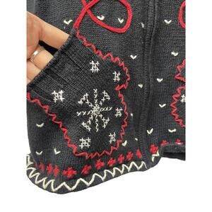 Get into the holiday spirit with this beautiful black embroidered sweater with snowflakes and mittens from Designers Original Studio Joy. It is so darn cute! Functional pockets. The sweater features a collared neckline, long sleeves, and a full zip style. It is made with a comfortable blend of ramie and cotton material, and the embroidered accents add a touch of elegance to the design.