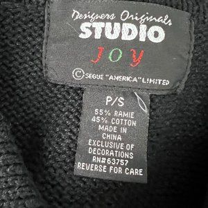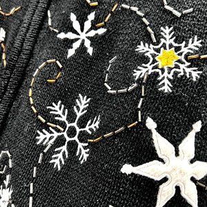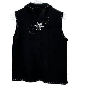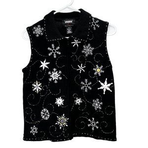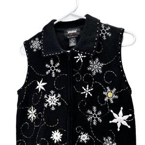 Designers Originals Studio Joy Christmas winter sweater in black. White embroidered snowflakes with beading. Zip front, sleeveless, collared, good condition. Size Petite Small.