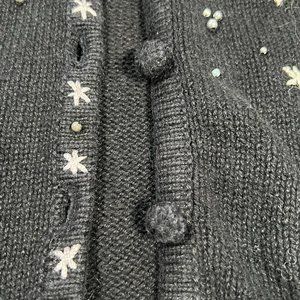 Designers Originals Studio Joy Sweater. Black cardigan with covered buttons. Silver/white thread embroidered snowflakes and silver beads across front and sleeves.