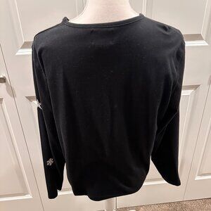 Good condition size large Designers Originals Studio black long-sleeve Christmas featuring a Santa motif. 60% cotton, 40% polyester. it's a soft knit.