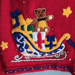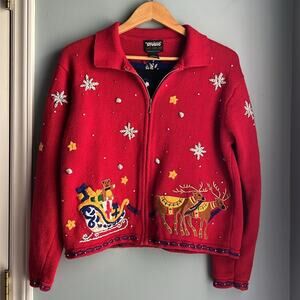 Super cute tacky Christmas sweater by Designers Originals. Very good preowned condition. Zipper sweater with lots of embellishments. Santa Claus and reindeer. Beading, embroidery of snowflakes, stars.
