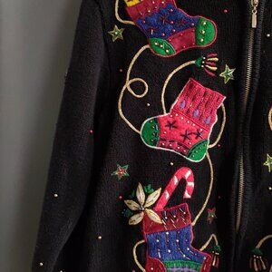 Designers Studio Originals Ugly Christmas Jacket Full Zip Stockings Embellished