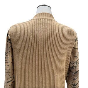 Vintage, suede jacket, knit jacket, animal print, zip-up jacket, braided knit accents, ribbed trim, beige jacket, tan jacket, fall fashion, rustic chic, bohemian style, casual layering, lightweight outerwear, trendy vintage, statement jacket, earth tones, safari-inspired, cottagecore, cozy chic, transitional wear, large size, Designers Studio Originals, celebrity street style, unique jacket, mountain retreat style, natural tones, nature-inspired fashion.